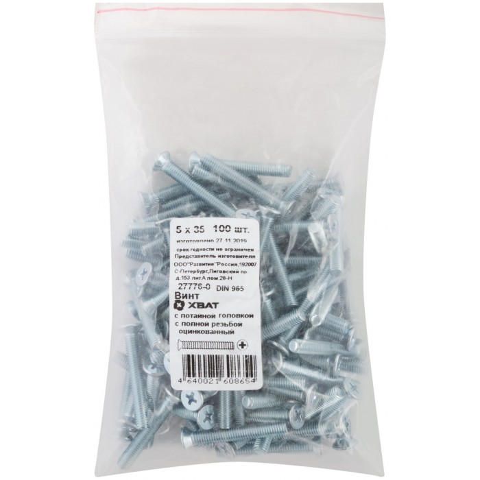 Винт с потайной головкой с полной резьбой оцинкованный DIN 965 5х35 100 шт Фасовка (27776-0)