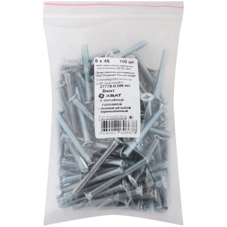 Винт с потайной головкой с полной резьбой оцинкованный DIN 965 5х45 100 шт Фасовка (27778-0)