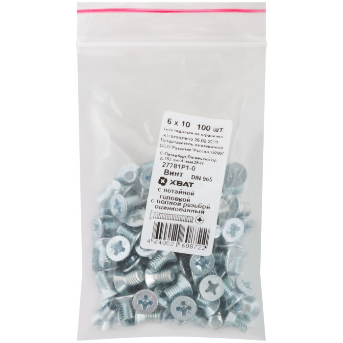 Винт с потайной головкой с полной резьбой оцинкованный DIN 965 6х10 100 шт Фасовка (27781Р1-0)