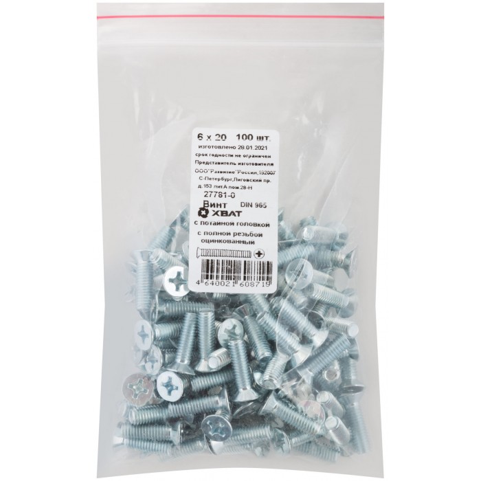 Винт с потайной головкой с полной резьбой оцинкованный DIN 965 6х20 100 шт Фасовка (27781-0)