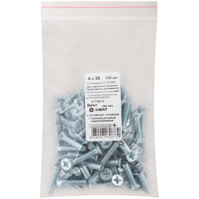 Винт с потайной головкой с полной резьбой оцинкованный DIN 965 6х25 100 шт Фасовка (27782-0)