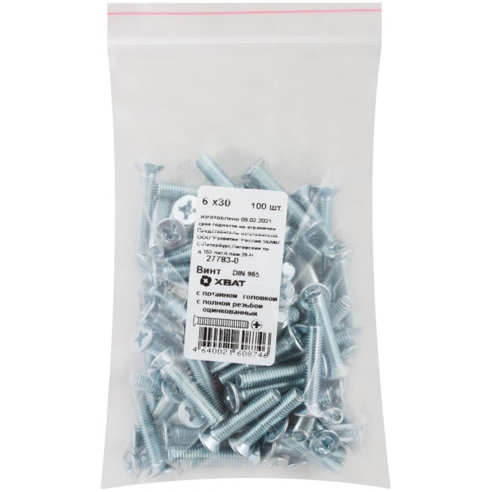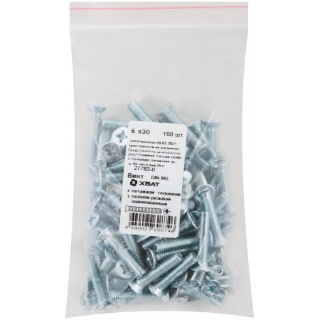 Винт с потайной головкой с полной резьбой оцинкованный DIN 965 6х30 100 шт Фасовка (27783-0)