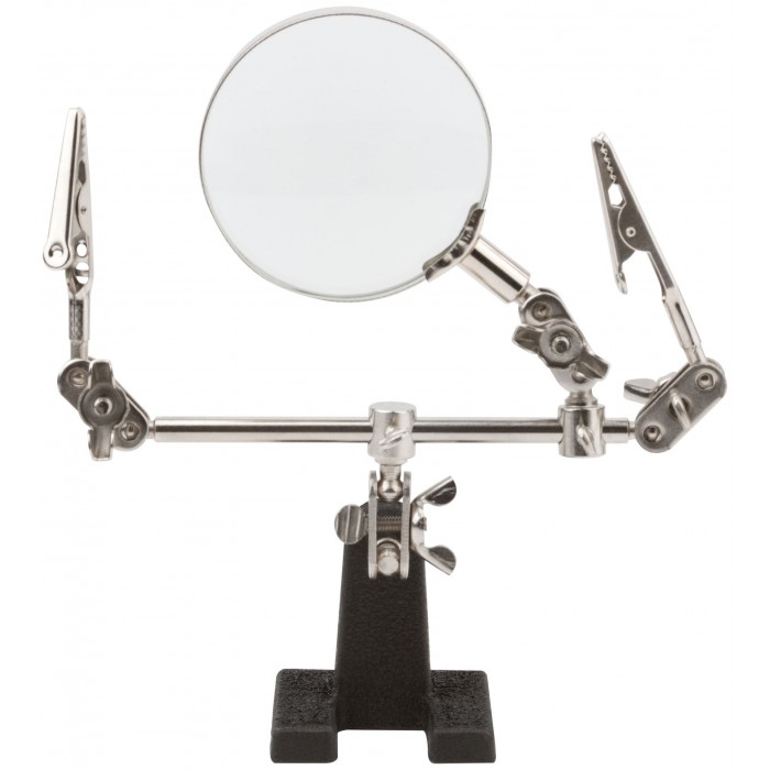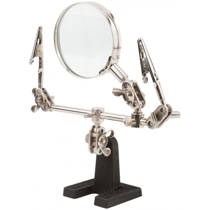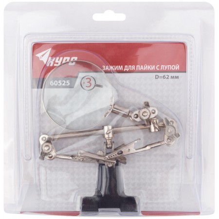 Зажим для пайки с лупой. Имеет устойчивую литую станину и зажимы, фиксирующие деталь при работе. 62 мм лупа с 3-х кратным увеличением позволяет работать с мелкими деталями и проводами. Упаковка: блистер.
