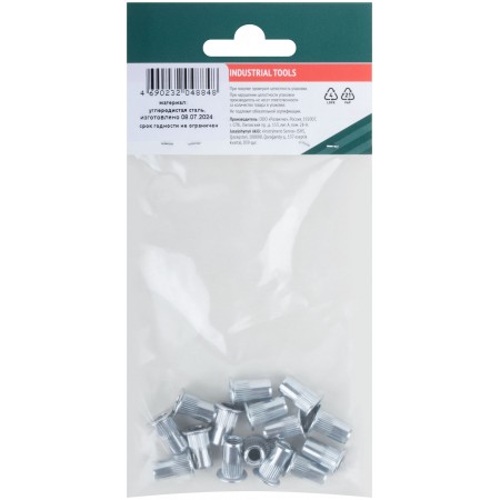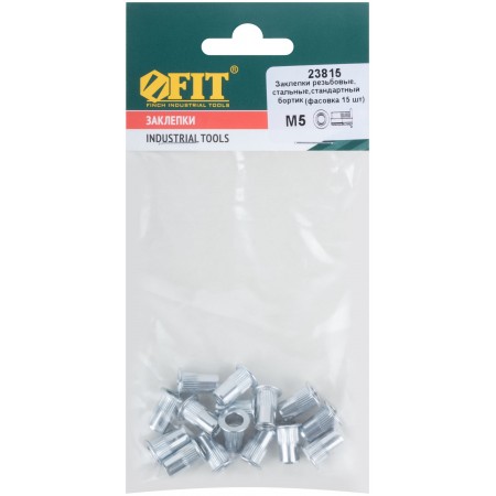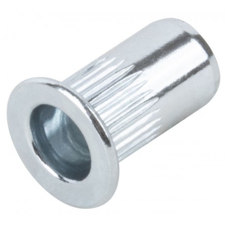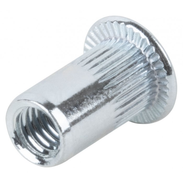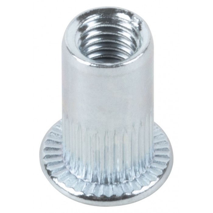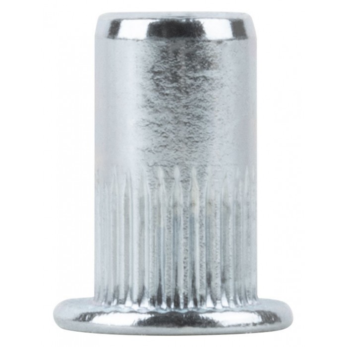 Стальная резьбовая заклепка с насечками и стандартным цилиндрическим бортиком, покрытие цинк. Применяются для скрепления тонколистовых материалов с получением в точке скрепления внутренней резьбы и последующего монтажа прикрепляемого материала. Упаковка: п/э пакет с подвесом.