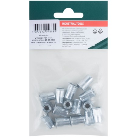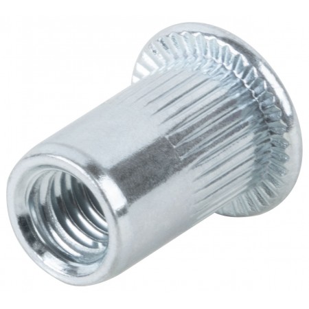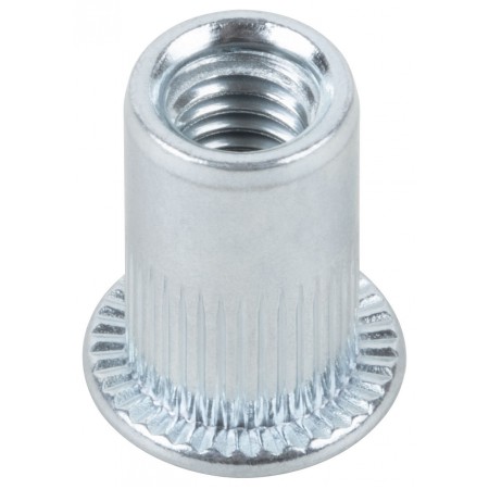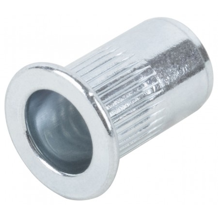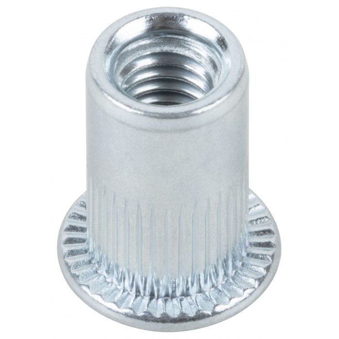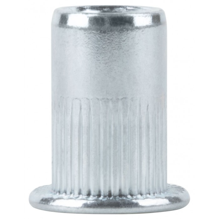 Стальная резьбовая заклепка с насечками и стандартным цилиндрическим бортиком, покрытие цинк. Применяются для скрепления тонколистовых материалов с получением в точке скрепления внутренней резьбы и последующего монтажа прикрепляемого материала. Упаковка: п/э пакет с подвесом.
