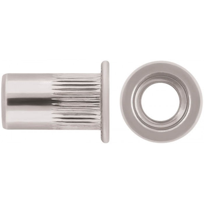 Стальная резьбовая заклепка с насечками и стандартным цилиндрицеским бортиком, покрытие желтый цинк. Применяются для скрепления тонколистовых материалов с получением в точке скрепления внутренней резьбы и последующего монтажа прикрепля◘емого материала.
