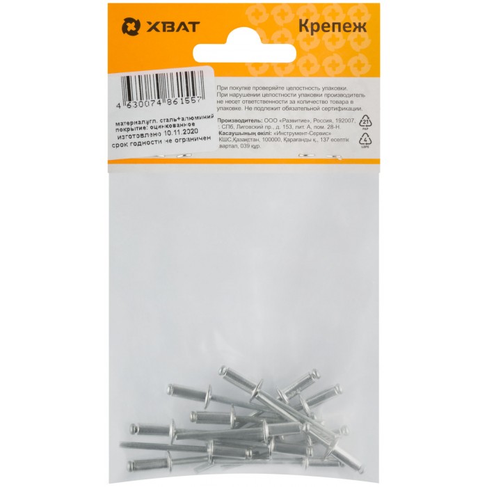 Предназначена для неразъемных соединения двух (или более) поверхностей. В процессе клепки образуется прочное, безопасное соединение. Конструкция корпуса заклепки обеспечивает большую силу сжатия материалов, а также поджимает соединяемые материалы, независимо от их толщины, в области сжатия. Материал: сердечник - сталь, рабочая часть - алюминий.