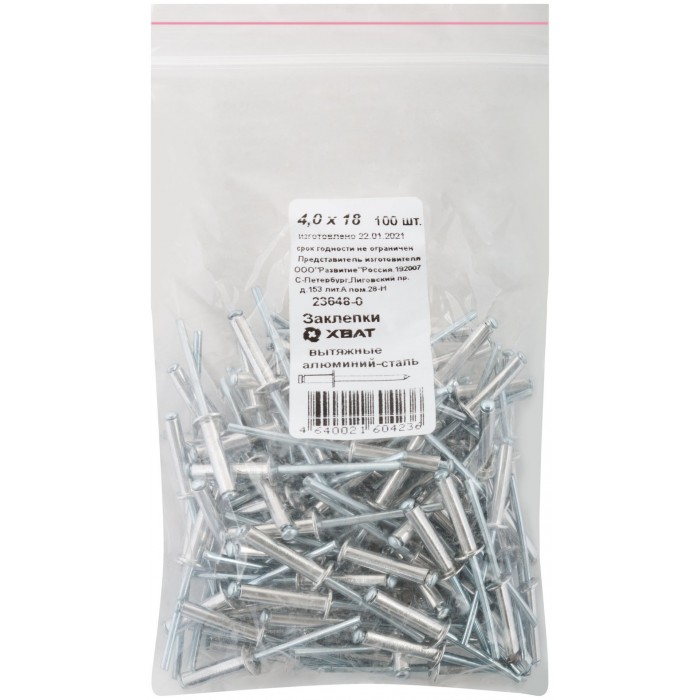 Заклепки вытяжные комбинированные, алюминий-сталь 4,0 х 18 100шт Фасовка (23648-0)