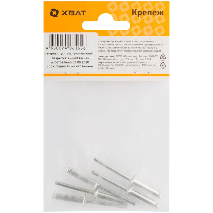 Предназначена для неразъемных соединения двух (или более) поверхностей. В процессе клепки образуется прочное, безопасное соединение. Конструкция корпуса заклепки обеспечивает большую силу сжатия материалов, а также поджимает соединяемые материалы, независимо от их толщины, в области сжатия. Материал: сердечник - сталь, рабочая часть - алюминий.
