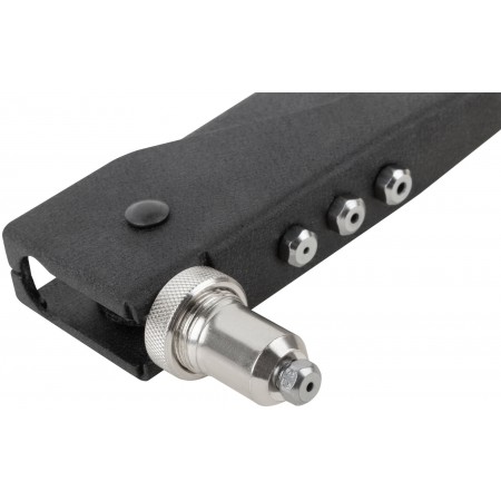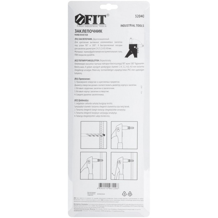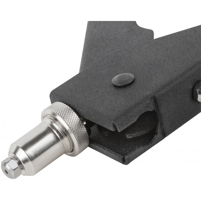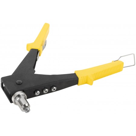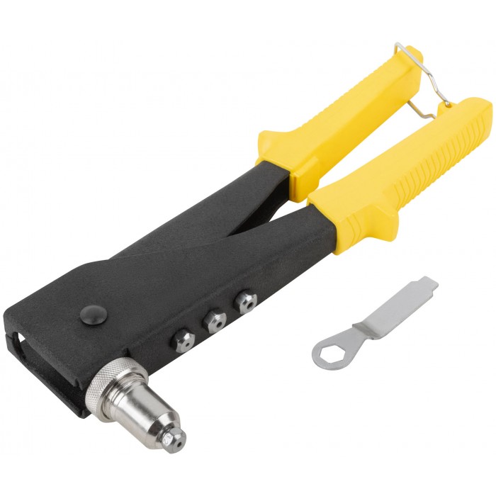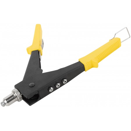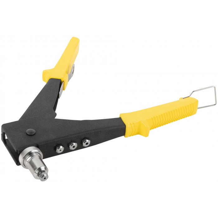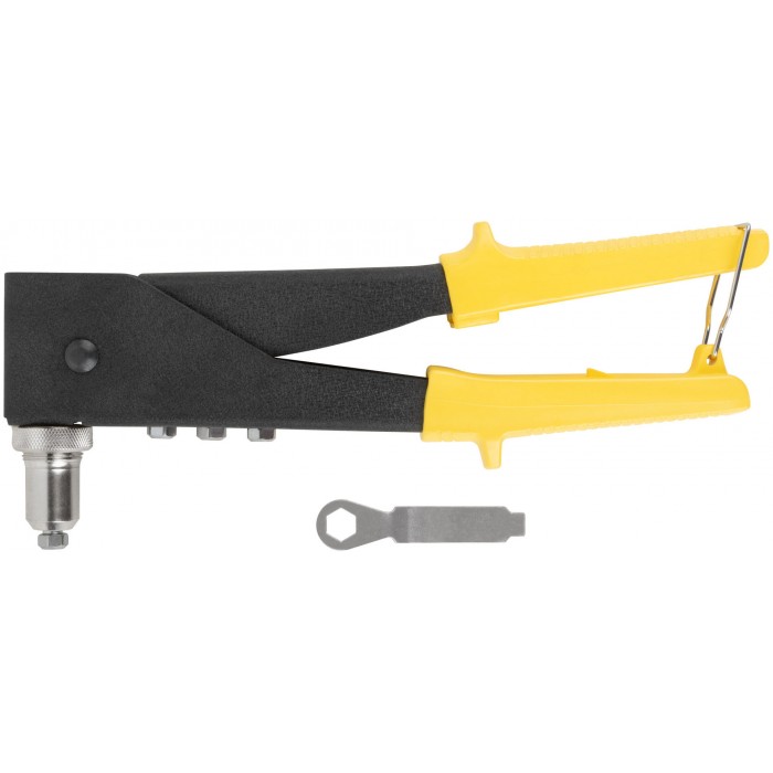 Двухпозиционный для крепления вытяжных алюминиевых заклёпок под углом 90° и 180°. 4 быстросменных насадки, пружинный рычаг для выброса сердечника от заклепок, рукоятка с покрытием из ПВХ пластика. Упаковка: блистер.