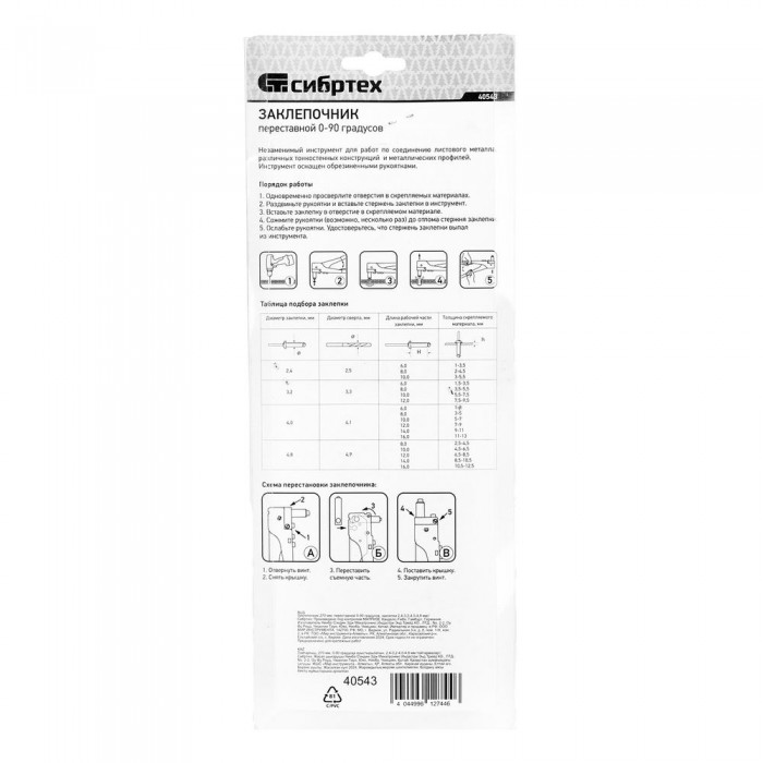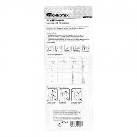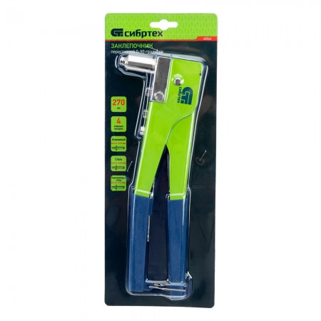 Заклепочник 270 мм, переставной 0-90 град, заклепки 2.4-3.2-4.0-4.8 мм Сибртех (40543)