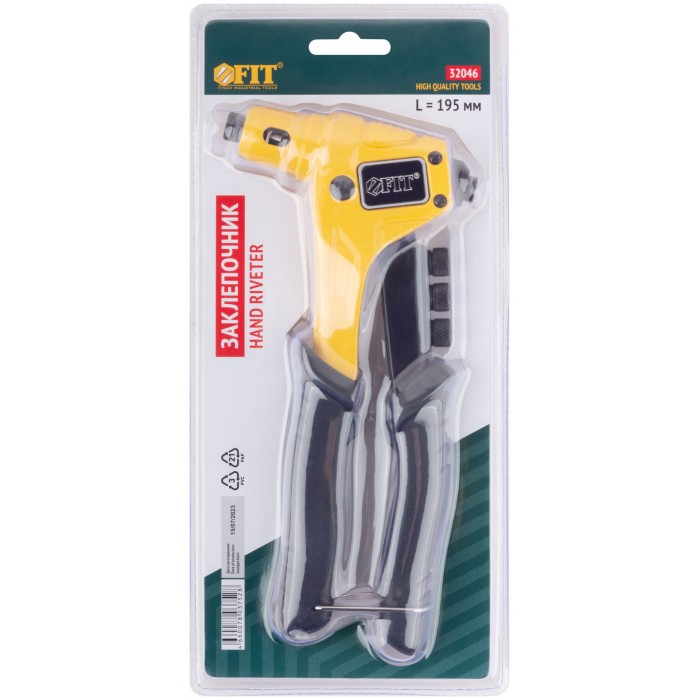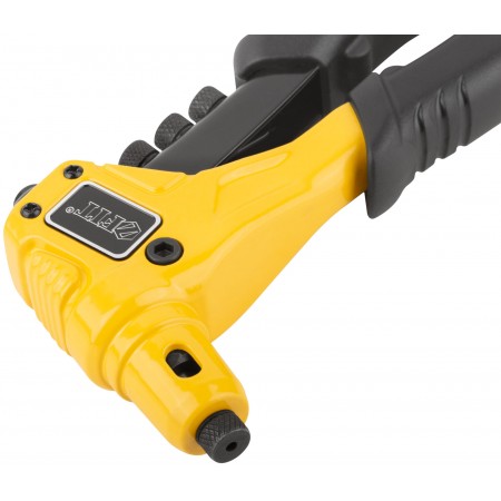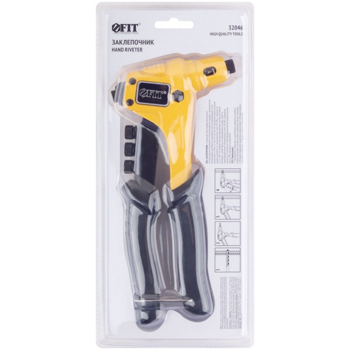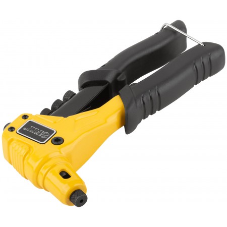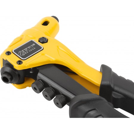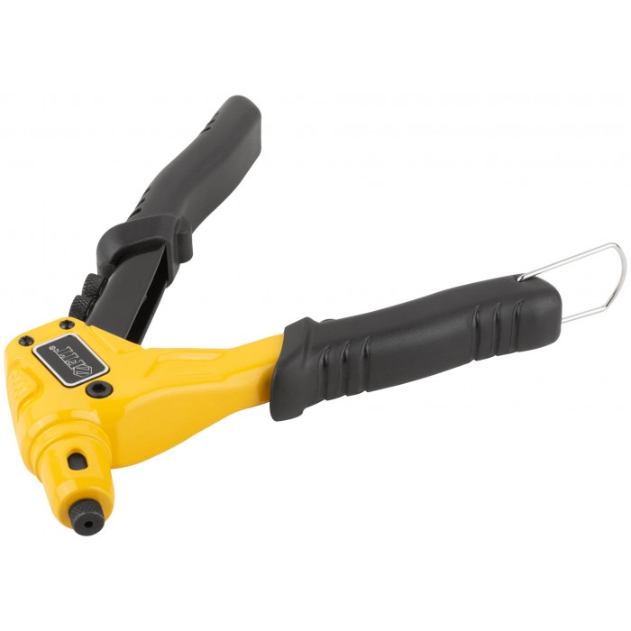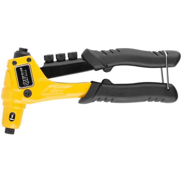 Профи. Для крепления вытяжных заклепок из алюминия, стали и нержавеющей стали. Усиленная конструкция. 4 быстросъемные насадки. Материал: литой корпус из алюминиевого сплава, трехкулачковый механизм захвата заклепок из хром-молибденовой стали, подвижная рукоятка и насадки из инструментальной стали, ПВХ накладки на рукоятках. Упаковка: блистер.