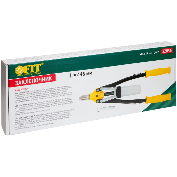 Заклепочник 445 мм. Для вытяжных заклепок из алюминия, стали и нержавеющей стали диаметром: 3.2, 4.0, 4.8, 6.0, 6.4 мм. Пластиковый контейнер для сбора отработанных сердечников заклепок. Материал: инструментальная сталь, алюминий, пластиковые рукоятки. Упаковка: картонная коробка.