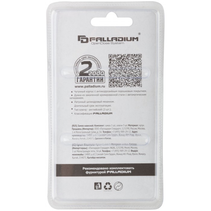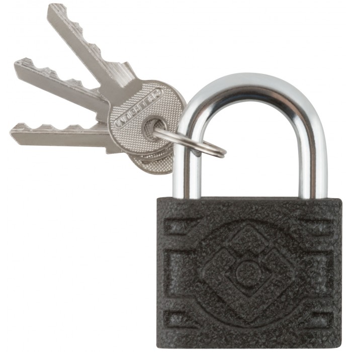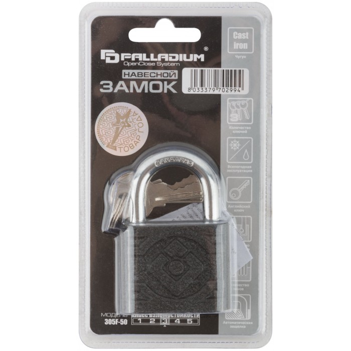 Материал: чугунный корпус, дужка и ключ из инструментальной стали. Тип ключа: английский. Автоматическое запирание. Закаленная дужка. Количество ключей: 3. Упаковка : блистер.