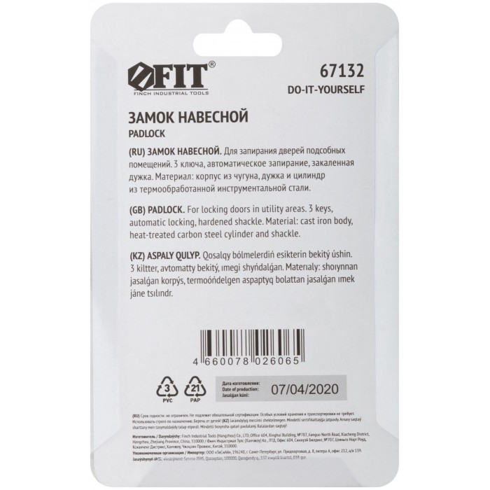 3 ключа. Автоматическое запирание. Материал: корпус из инструментальной стали, дужка из закаленной инструментальной стали. Упаковка: блистер.