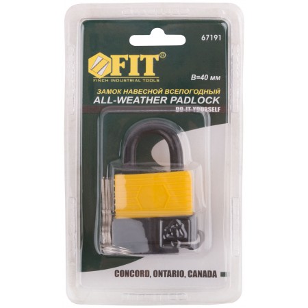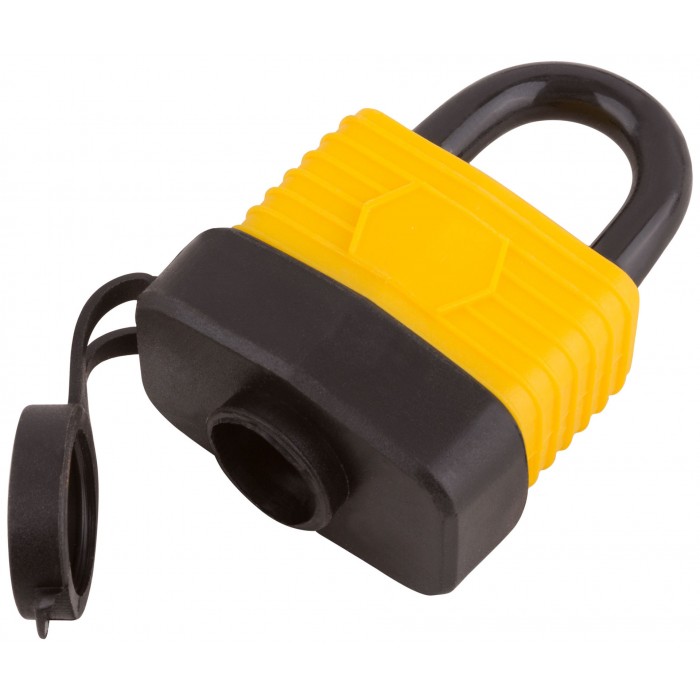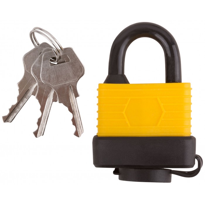 Всепогодный. Автоматическое запирание. Материал: инструментальная сталь, пластик.3 ключа. Пластиковый чехол на корпусе и специальная заглушка отверстия для ключа предохраняет замок от ржавчины. Упаковка: блистер.