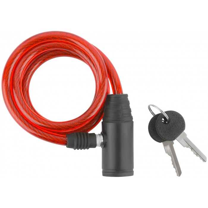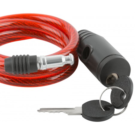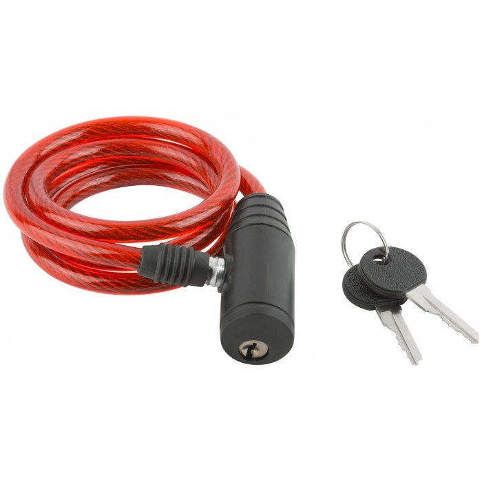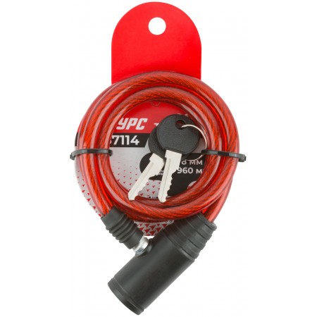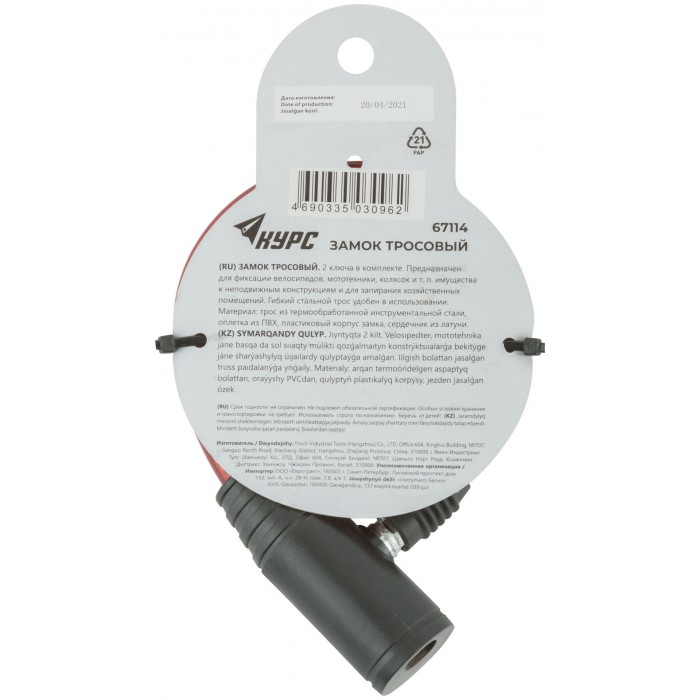 Материал: трос из инструментальной стали, оплетка из ПВХ, пластиковый корпус замка, сердечник из латуни. 2 ключа в комплекте. Упаковка: картонный подвес.