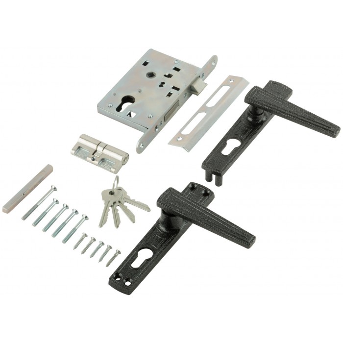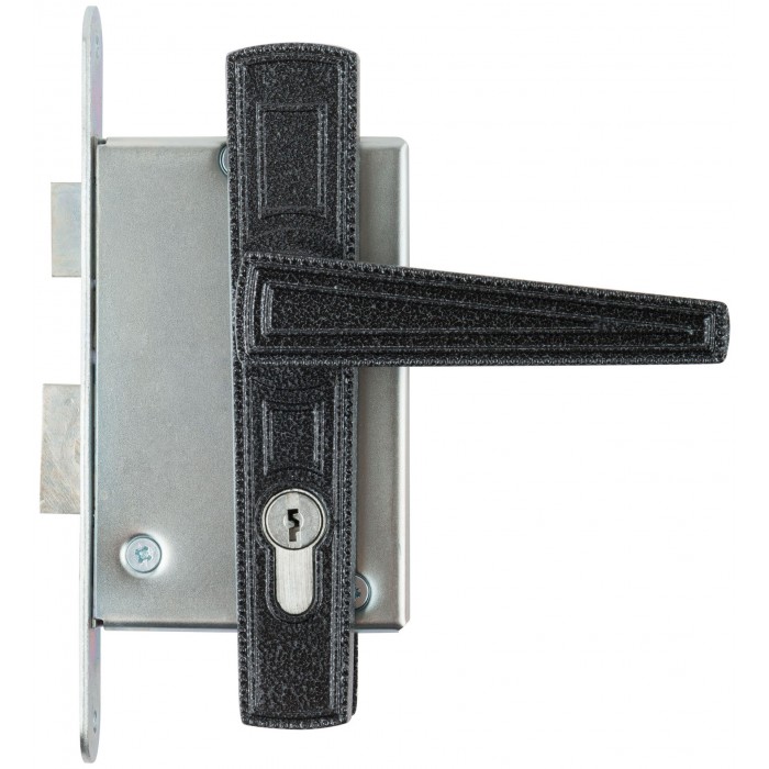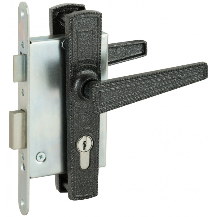 Цилиндровый, межцентровое расстояние 85 мм. Левые и правые двери 40-50 мм. Фалевые ручки с полимерным покрытием. 3-х стержневой засов.