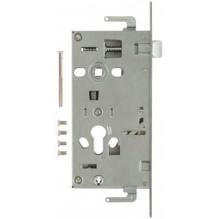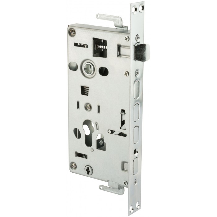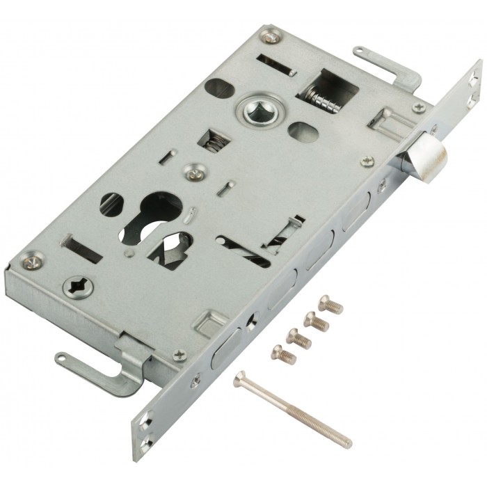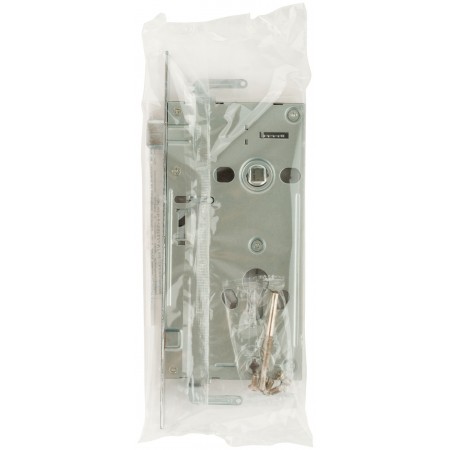 Замок врезной цилиндровый с защелкой и задвижкой, без механизма секрета. Предназначен для установки в китайские металлические двери, в качестве основного замка. Реверсивная защелка позволяет устанавливать замок на правые и левые двери. Три прямоугольных стальных ригеля. Вылет ригелей 20мм. 3 точки запирания. Удаление ключевого отверстия 60мм. Межосевое расстояние 68мм. Расстояние от центра механизма секрета до задвижки 52мм. Цвет торцевой планки- хром, ширина 24 мм. Материал: сталь 0,9мм. Упаковка: Картонная коробка.