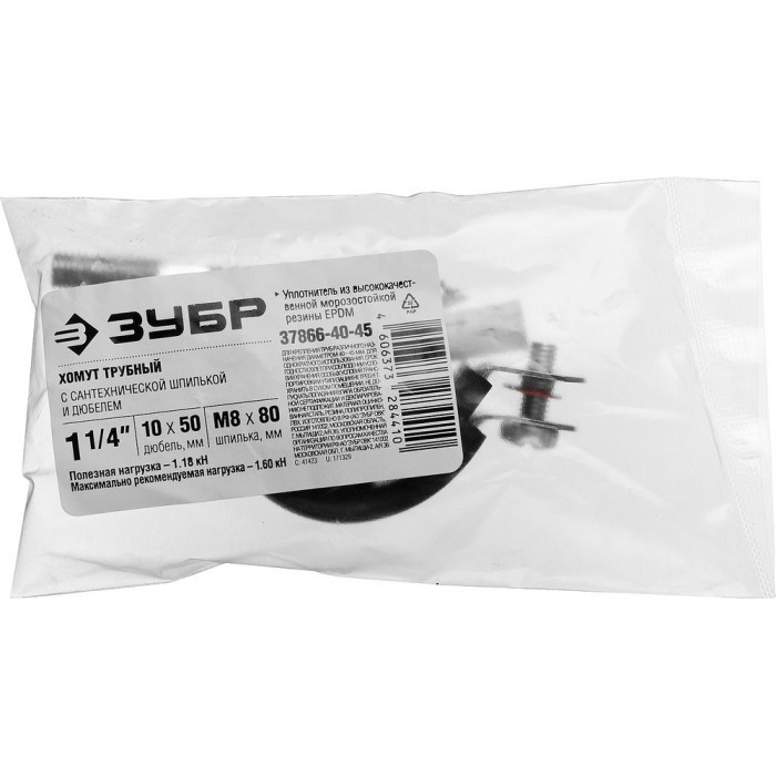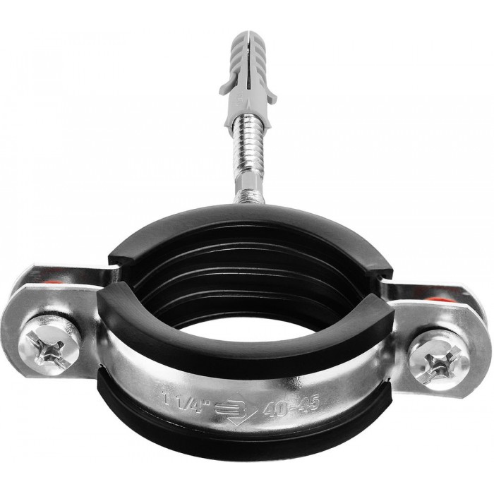 - Комплектность набора позволяет крепить хомут как с помощью гайки, так и с использованием шпильки и дюбеля