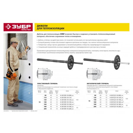 Дюбель для изоляционных материалов 10?160 мм пластиковый стержень 100 шт ЗУБР 4-301505-10-160_z01