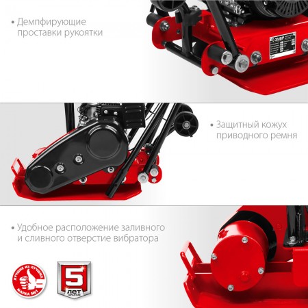 Виброплита предназначена для уплотнения бетонных, асфальтовых и сыпучих материалов, а также для формирования уплотненных поверхностей. Компактная конструкция позволяет осуществлять уплотнение смешанного грунта в самых узких местах, даже в очень узких траншеях. Направляющая рукоятка с виброзащитой позволяет увеличить количество часов непрерывной работы и снизить усталость для оператора. Четырехтактный двигатель ″ЗУБР″ обеспечит беспроблемную эксплуатацию при минимальном сервисном обслуживании на весь срок использования.