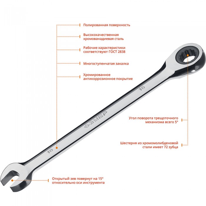 Ключ гаечный комбинированный трещоточный 10 мм Профессионал ЗУБР 27074-10