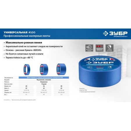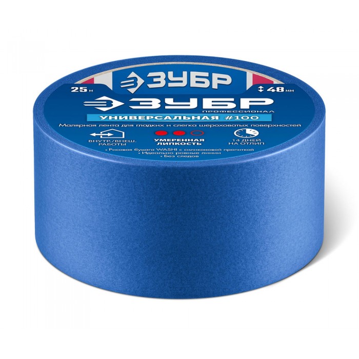 Лента малярная №100, 48 мм x 25 м, для гладких и слегка шероховатых поверхностей ЗУБР Профессионал 12141-48
