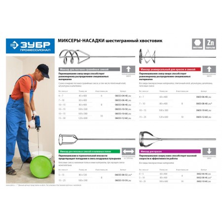 Миксер-насадка предназначен для перемешивания сухих и жидких песчано-гравийных смесей, в том числе плиточного клея, штукатурки и шпатлевки. Используется с дрелями и миксерами, обеспечивающими крепление шестигранного хвостовика насадки.