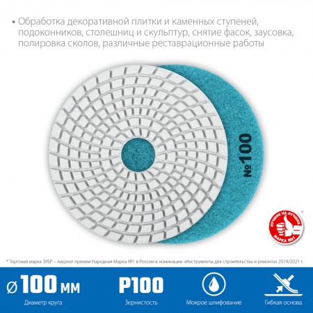 Для шлифовки и полировки изделий из натурального и искуственного камня, керамогранита, гранита, мрамора с применением водяного охлаждения. Используется на ручном электроинструменте (УШМ, полировальные машины, дрели) с насадкой адаптером под липучку Velcro.
