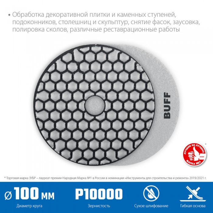 Для сухой шлифовки и полировки изделий из натурального и искуственного камня, керамогранита, гранита, мрамора. Используется на ручном электроинструменте (УШМ, полировальные машины, дрели) с насадкой адаптером под липучку Velcro. Охлаждение водой повышает ресурс инструмента.