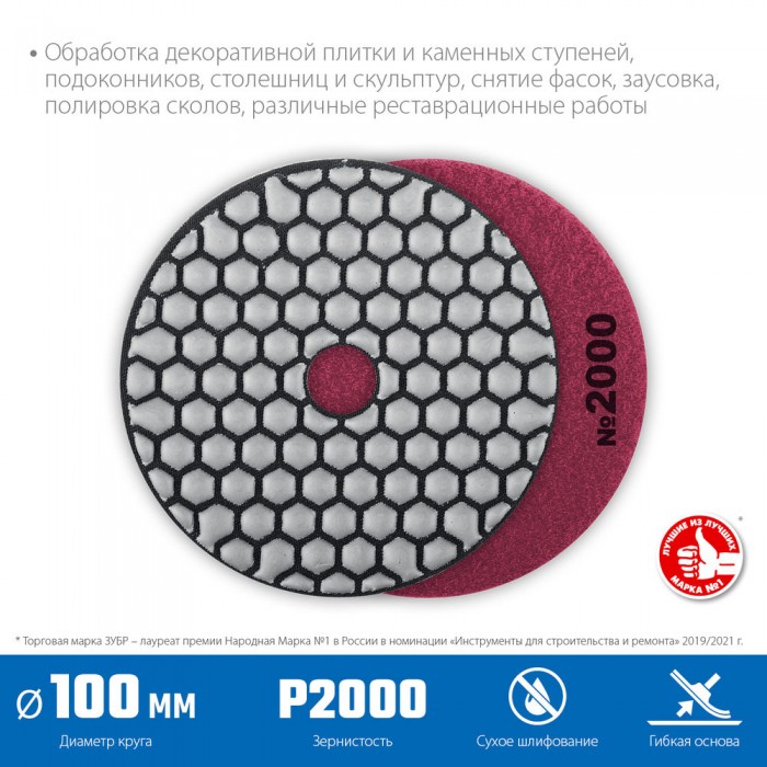 Для сухой шлифовки и полировки изделий из натурального и искуственного камня, керамогранита, гранита, мрамора. Используется на ручном электроинструменте (УШМ, полировальные машины, дрели) с насадкой адаптером под липучку Velcro. Охлаждение водой повышает ресурс инструмента.