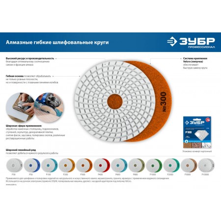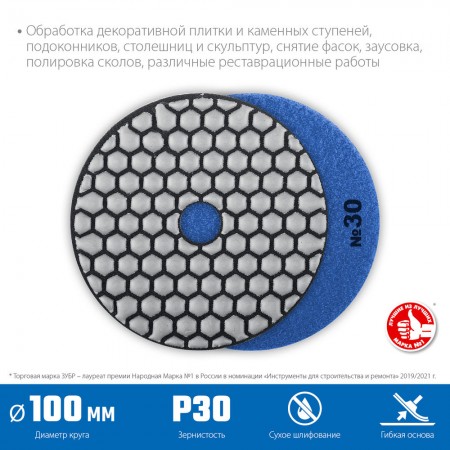 Для сухой шлифовки и полировки изделий из натурального и искуственного камня, керамогранита, гранита, мрамора. Используется на ручном электроинструменте (УШМ, полировальные машины, дрели) с насадкой адаптером под липучку Velcro. Охлаждение водой повышает ресурс инструмента.