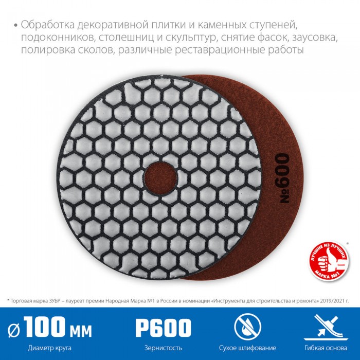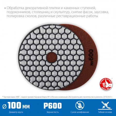 Для сухой шлифовки и полировки изделий из натурального и искуственного камня, керамогранита, гранита, мрамора. Используется на ручном электроинструменте (УШМ, полировальные машины, дрели) с насадкой адаптером под липучку Velcro. Охлаждение водой повышает ресурс инструмента.
