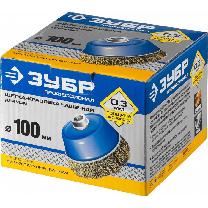 Щетка-крацовка чашечная для УШМ 100 мм, витая стальная латунированная проволока 0.3 мм ЗУБР Профессионал 3526-100_z02