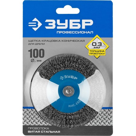 Щетка коническая для дрели 100 мм, витая стальная латунированная проволока 0.3 мм ЗУБР Профессионал 35230-100_z02