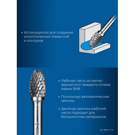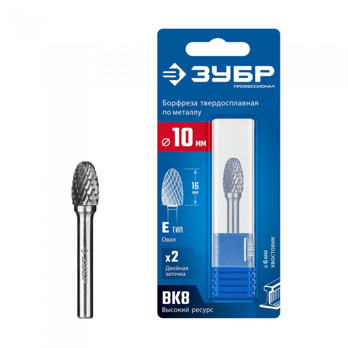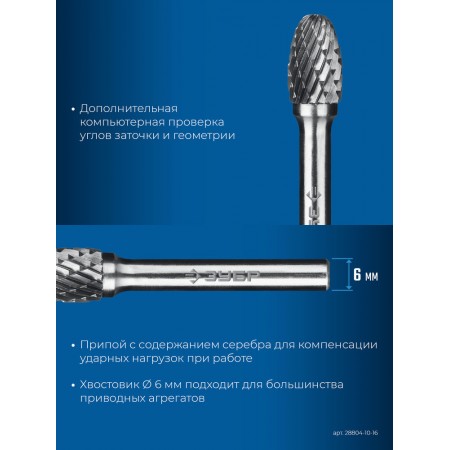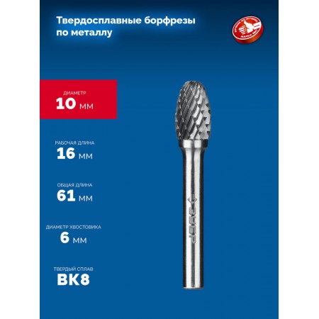 Борфреза твердосплавная 10?16 мм тип E овал радиус 4.0 мм хв-к 6 мм Профессионал ЗУБР 28804-10-16