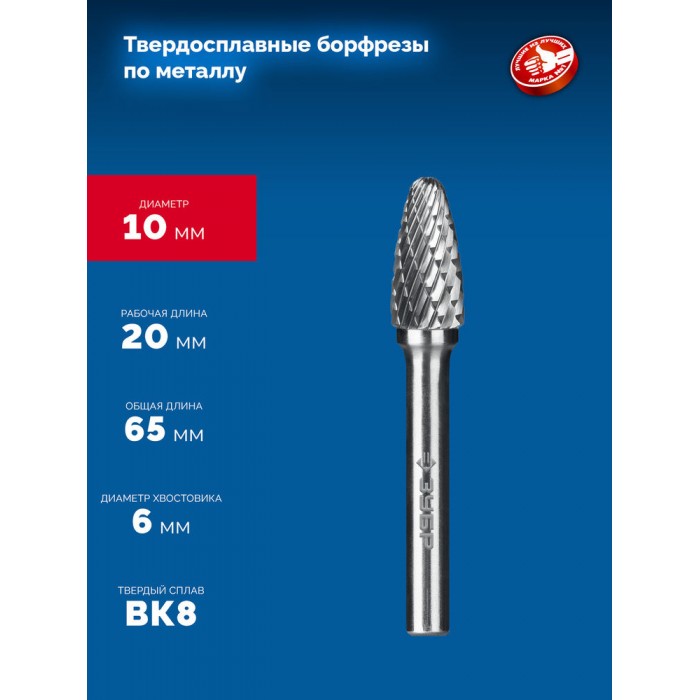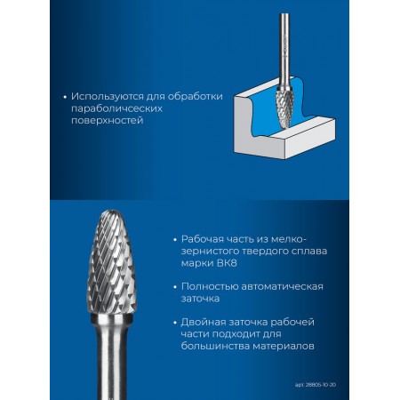Борфреза твердосплавная 10?20 мм тип F парабола с закругленным углом радиус 2.5 мм хв-к 6 мм Профессионал ЗУБР 28805-10-20