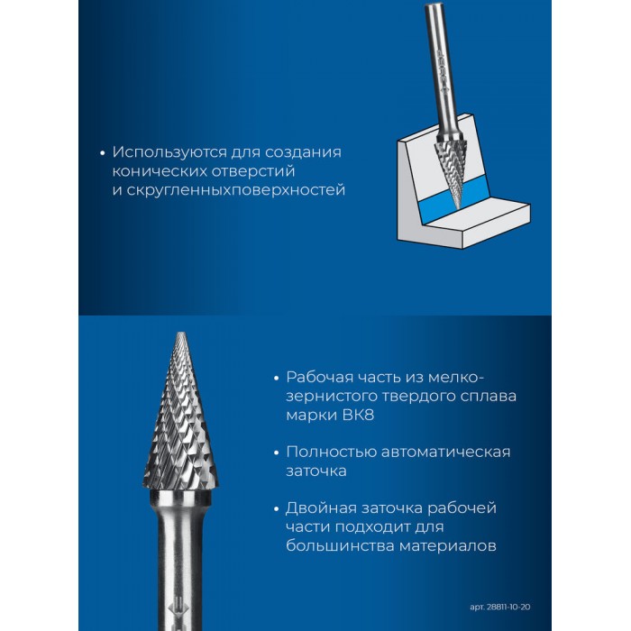 Борфреза твердосплавная 10?20 мм тип M конус с острым углом 25° хв-к 6 мм Профессионал ЗУБР 28811-10-20
