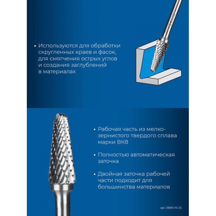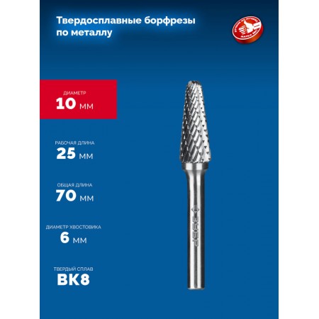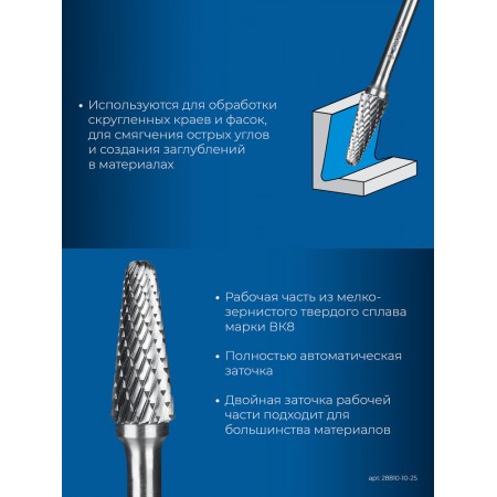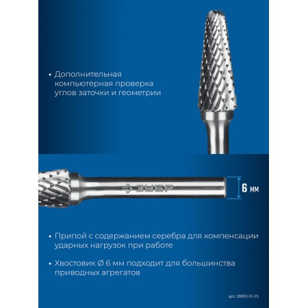 Борфреза твердосплавная 10?25 мм тип L конус с закругленным углом 28° радиус 2.2 мм хв-к 6 мм Профессионал ЗУБР 28810-10-25