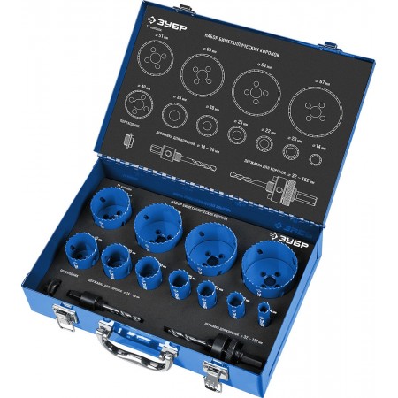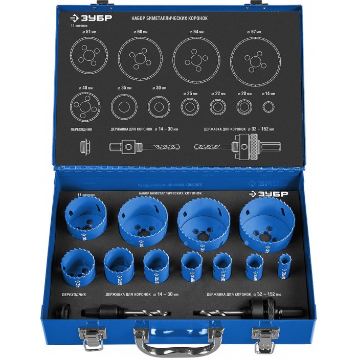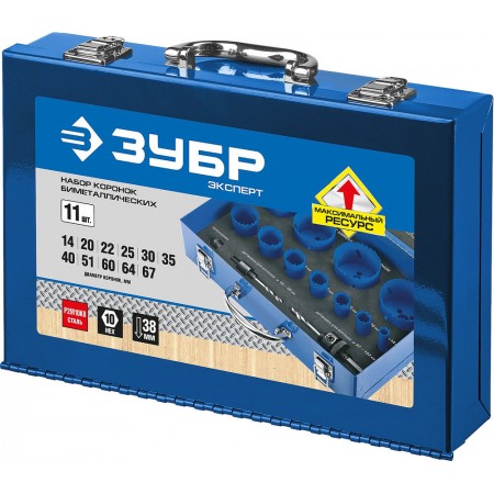 Набор биметаллических коронок 11 шт, сталь Р6М5, (14,20,22,25,30.35,40.51.60,64,67) ЗУБР 29531-H11