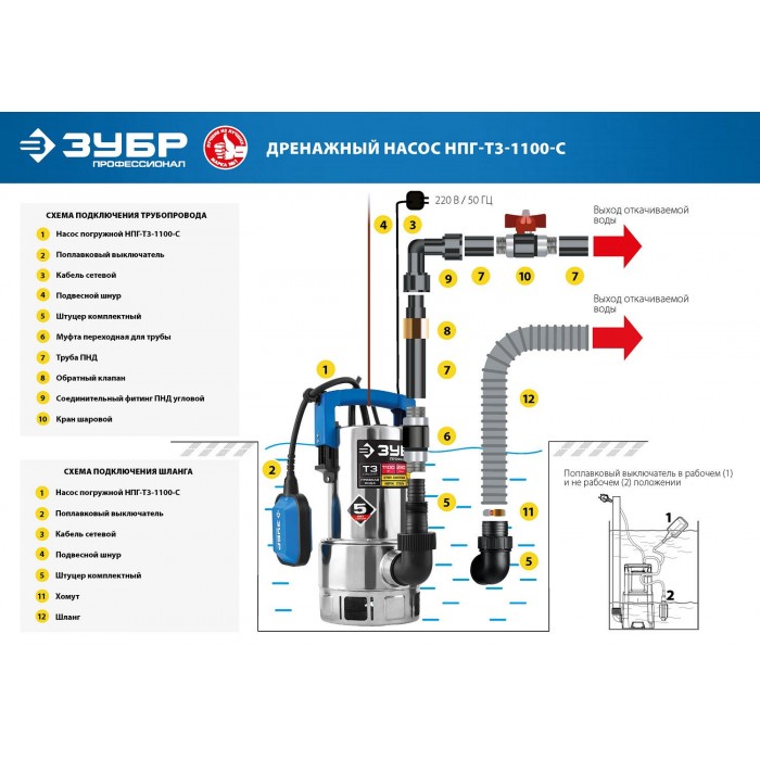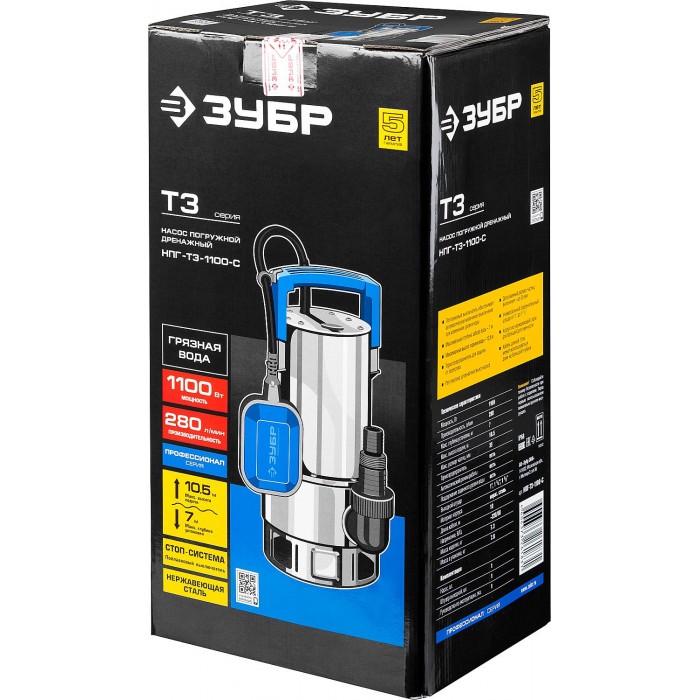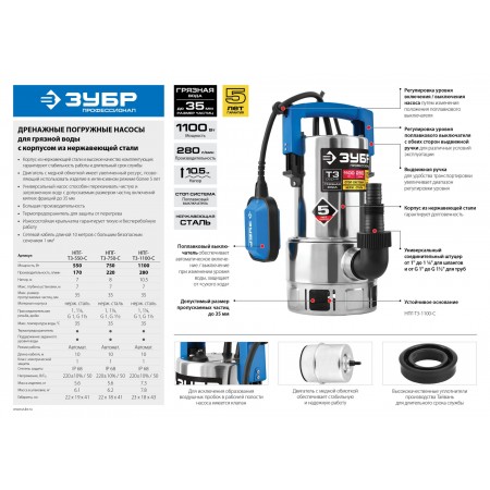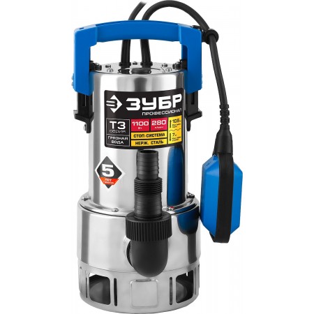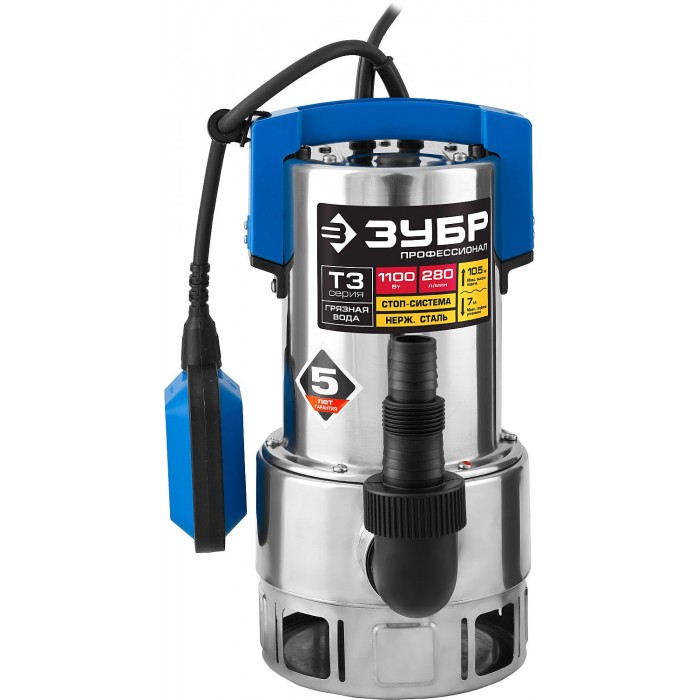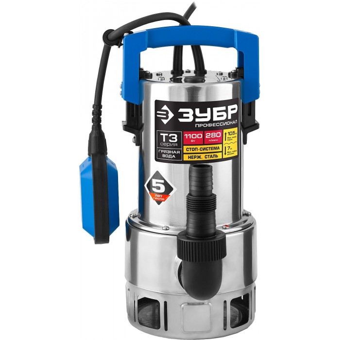 ЗУБР 1100 Вт, дренажный насос для грязной воды, корпус - нерж. сталь, Профессионал (НПГ-Т3-1100-С)