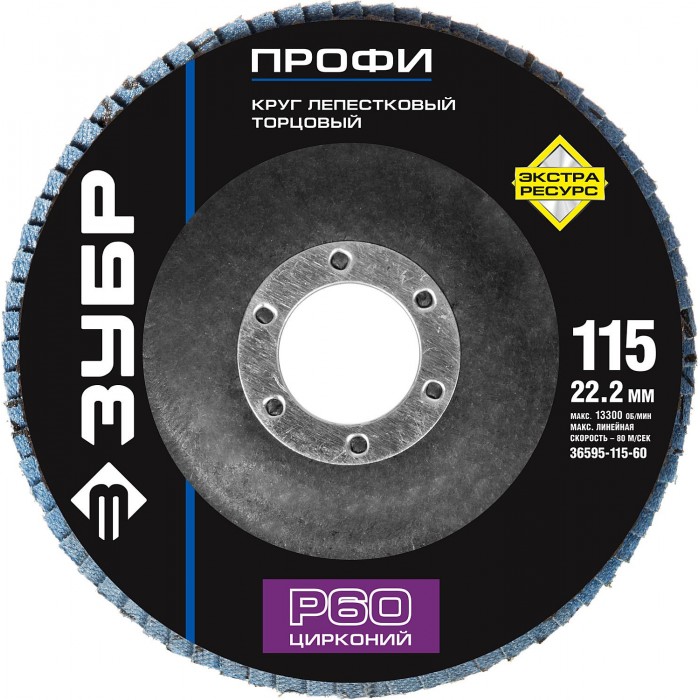 ЗУБР 115 мм, P60, КЛТ, круг лепестковый торцевой циркониевый (36595-115-60)