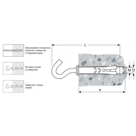 Для монтажа конструкций к полнотелым основаниям: поверхностям из бетона, полнотелого кирпича или природного камня. Анкер устанавливается в предварительно просверленное и очищенное от буровой муки отверстие и расклинивается при закручивании резьбового стержня