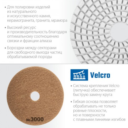 Для шлифовки и полировки изделий из натурального и искуственного камня, керамогранита, гранита, мрамора с применением водяного охлаждения. Используется на ручном электроинструменте (УШМ, полировальные машины, дрели) с насадкой адаптером под липучку Velcro.