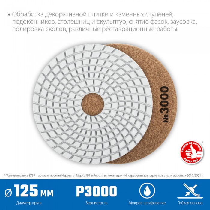 Круг алмазный гибкий шлифовальный АГШК 125 мм, №600, мокрое шлифование ЗУБР Профессионал 29867-600