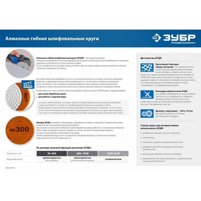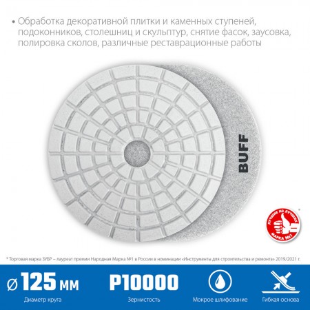 Круг алмазный гибкий шлифовальный АГШК 125 мм, BUFF, мокрое шлифование ЗУБР Профессионал 29867-10000