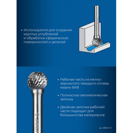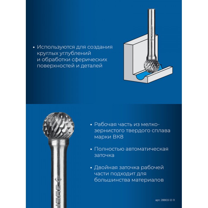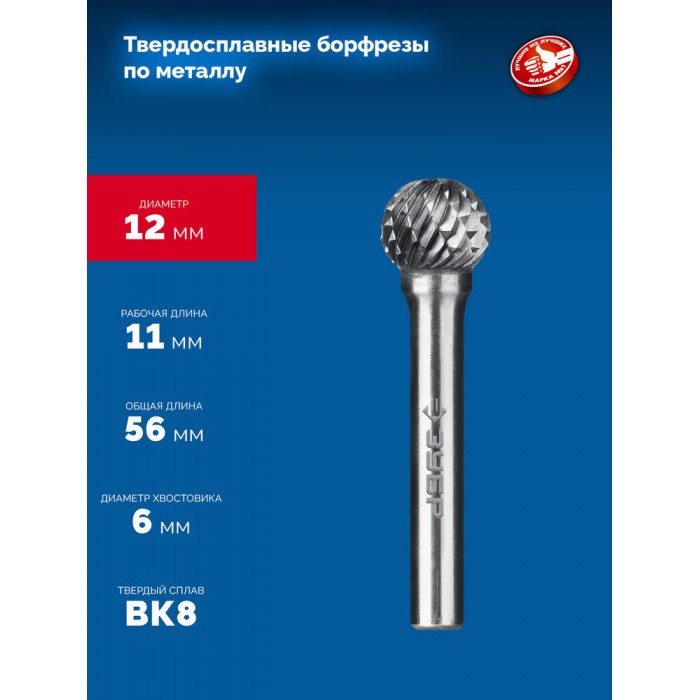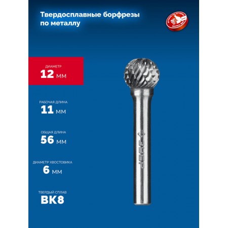 Борфреза твердосплавная 12?11 мм, тип D (сфера), хв-к 6 мм ЗУБР ПРОФЕССИОНАЛ 28803-12-11
