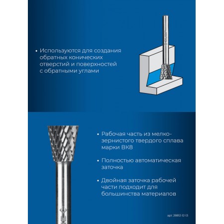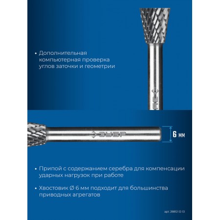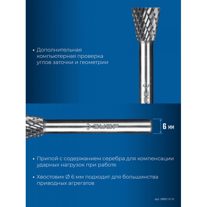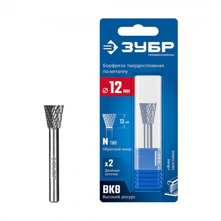 Борфреза твердосплавная 12?13 мм, тип N (обратный конус, угол 30°), хв-к 6 мм ЗУБР ПРОФЕССИОНАЛ 28812-12-13