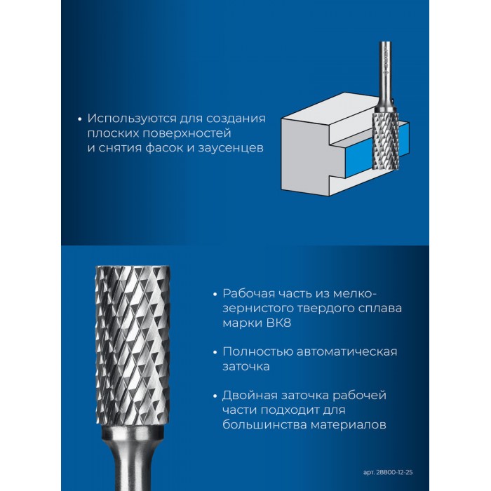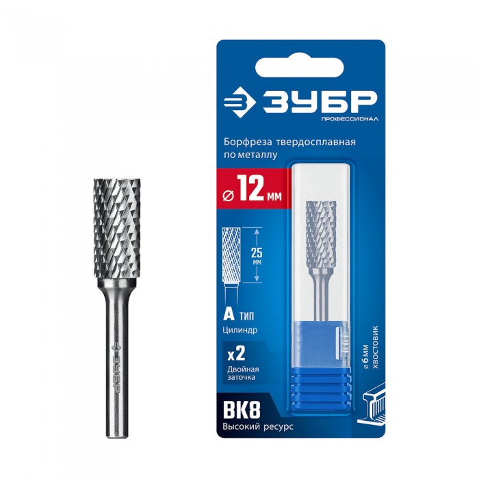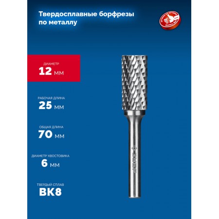 Борфреза твердосплавная 12?25 мм тип А цилиндр с гладким торцом хв-к 6 мм Профессионал ЗУБР 28800-12-25